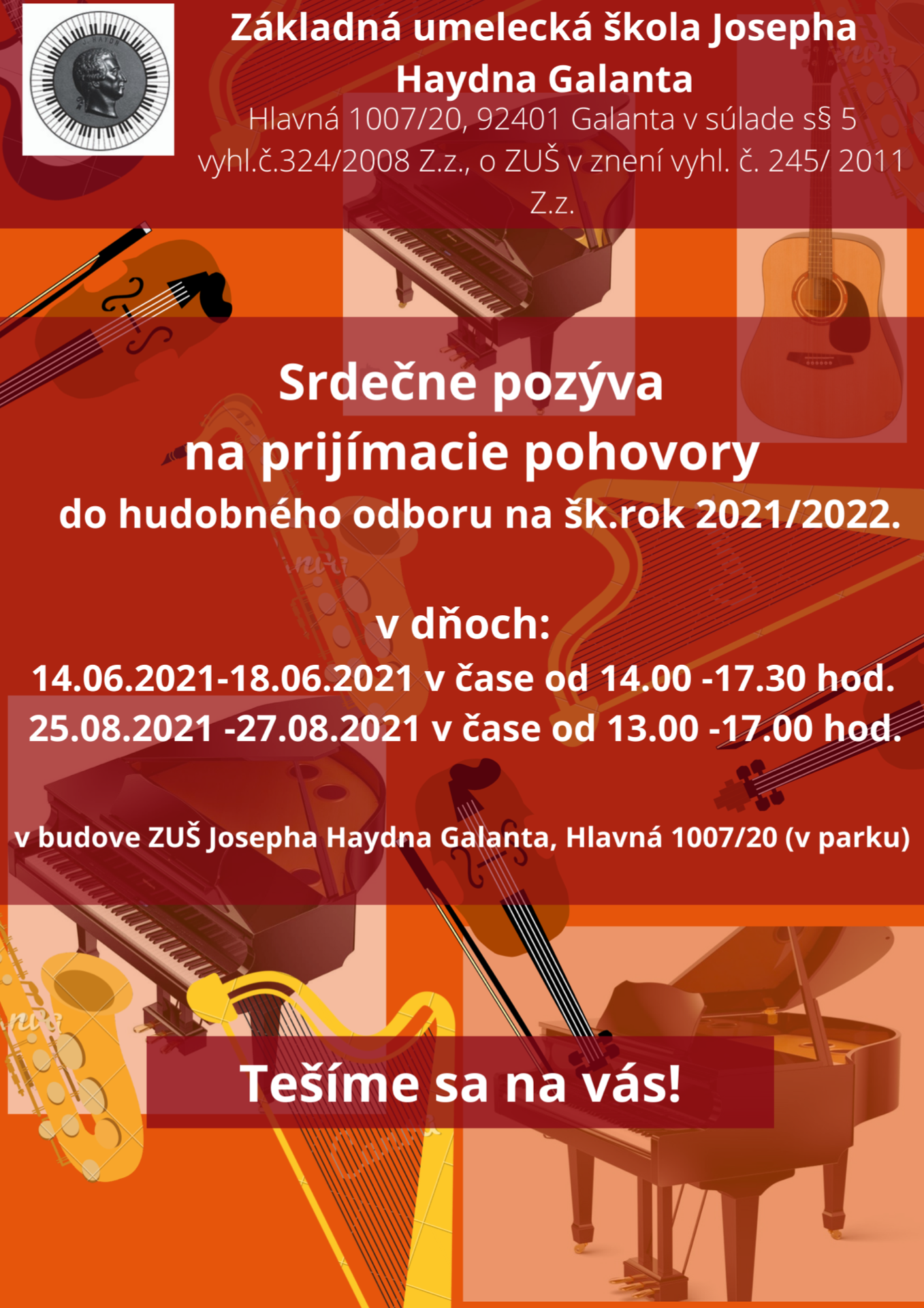 Vážení záujemcovia, pozývame vás na prijímacie skúšky, kt. sa budú konať v dňoch: 6.-8.júna 2022 od 13.30 - 17.00 v budove ZUŠ Josepha Haydna v Galante, na urýchlenie prihlasovania môžete vyplniť online prihlášku prostredníctvom priloženého linku: https://www.izus.cz/prihlaska_do_zus/nova/